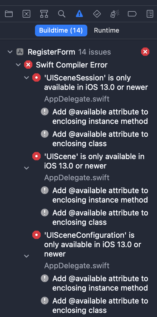 요즘 iOS13.0 이전 버전을 사용하는 유저는 거의 없겠지만 극소수는 존재할거라 생각합니다... 하지만 우리가 프로젝트를 만들면 자동으로 SceneDelegate.swift파일이 생겨 13.0 이전 버전을 테스트하는 경우 오류가 발생하게됩니다. 이와 같이...