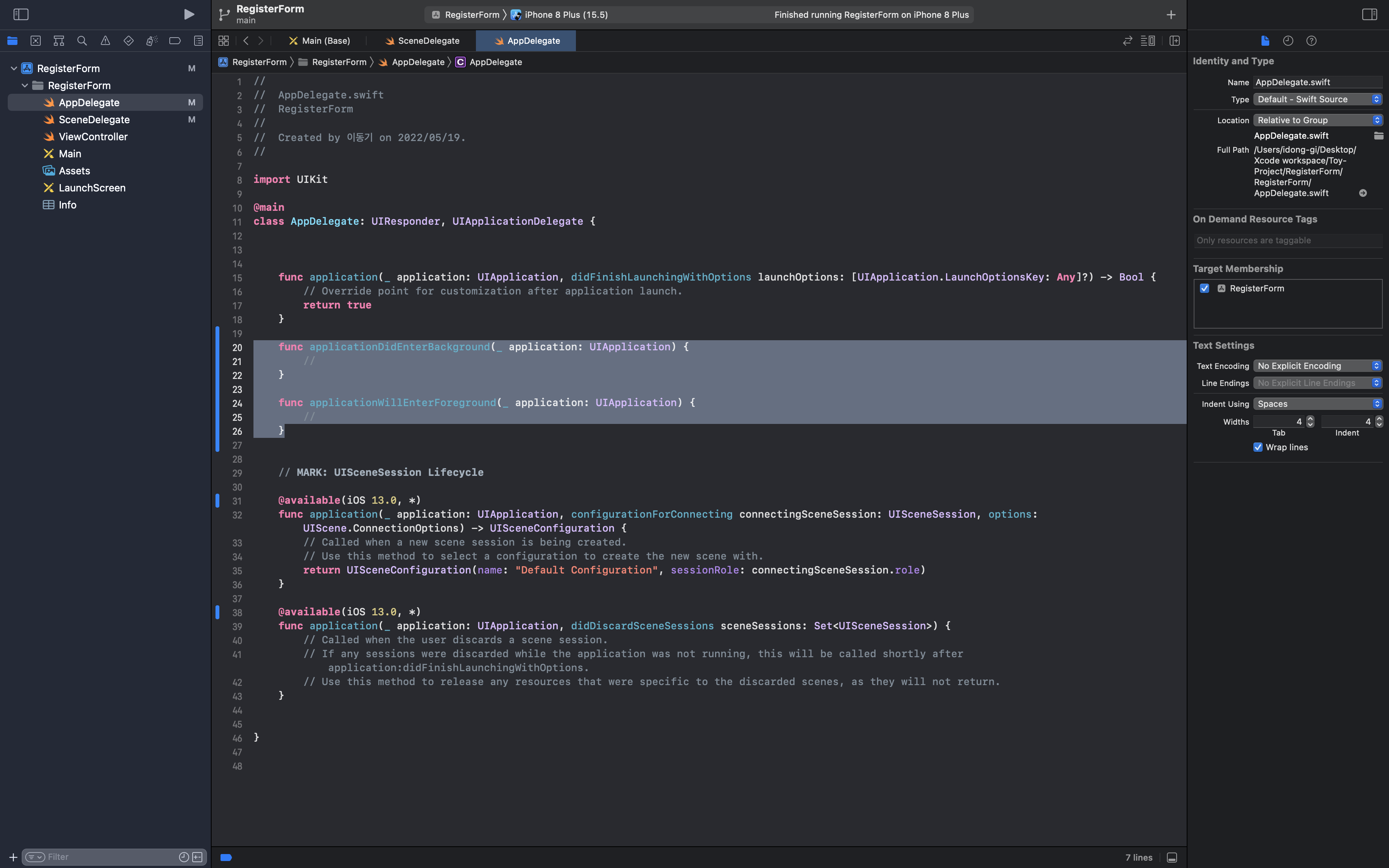iOS12에서 iOS13으로 넘어오면서 큰 변화가 생겼습니다. 바로 SceneDelegate의 등장입니다. 이전까지는 AppDelegate가 모든 생명주기 관련 이벤트들을 담당했습니다. 프로젝트를 만들면 생성되는 AppDelegate.swift파일입니다.