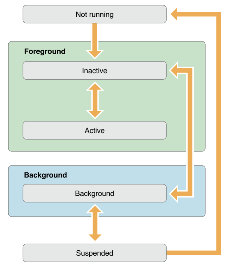 앱의 상태변화는 운영체제가 처리하는 영역입니다. 아이폰의 경우 iOS 운영체제가 시스템의 상황에 맞게 발생하는 상황에 맞춰 앱의 상태를 변화시키고 제어합니다. 예를 들면 모바일 게임을 하는 도중 전화가 오면 실행되는 앱이 화면에서 사라지고 통화화면이 실행되는 것 그리고 통화가 끝나면 다시 게임으로 화면이 돌아오는 것 이러한 일련의 과정을 상태 변화라고 합니다.