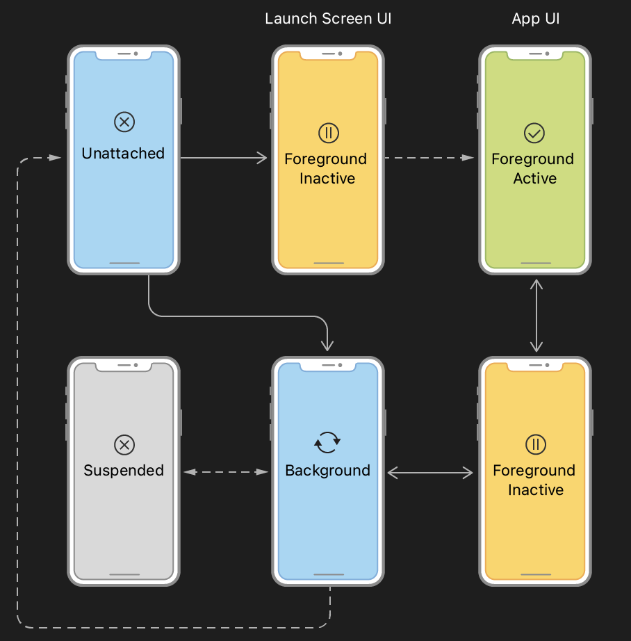 이로인해 사용자나 시스템이 새로운 scene를 만들어달라고 요청했을 때 UIKit은 scene를 만들어 Unattached상태로 만듭니다. 사용자가 요청한 scene은 바로 Foreground 상태를 거쳐 Active 상태가 되고, 시스템이 요청한 Scene은 보통 Background 상태가 되어 이벤트를 처리한 뒤 Foreground로 올라옵니다.
