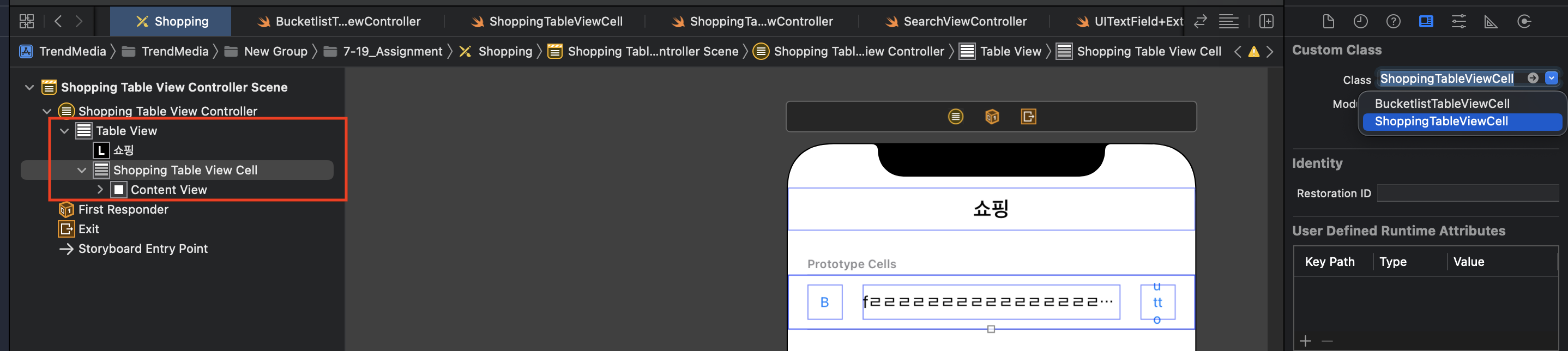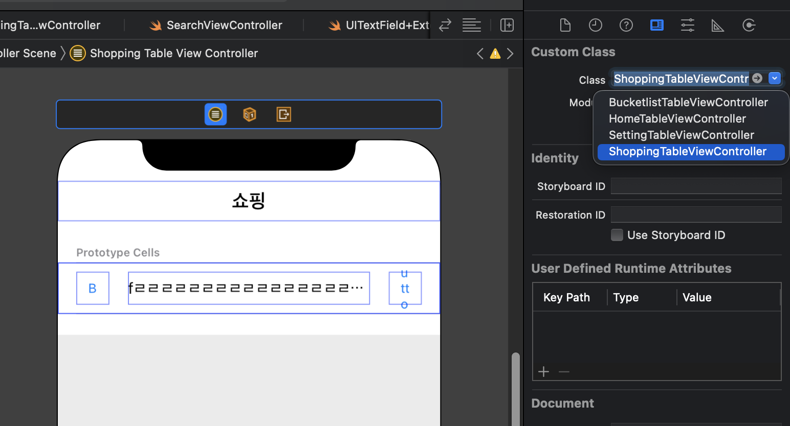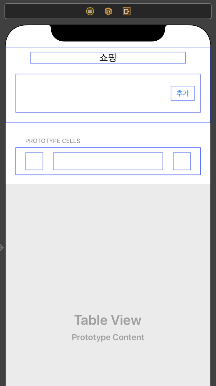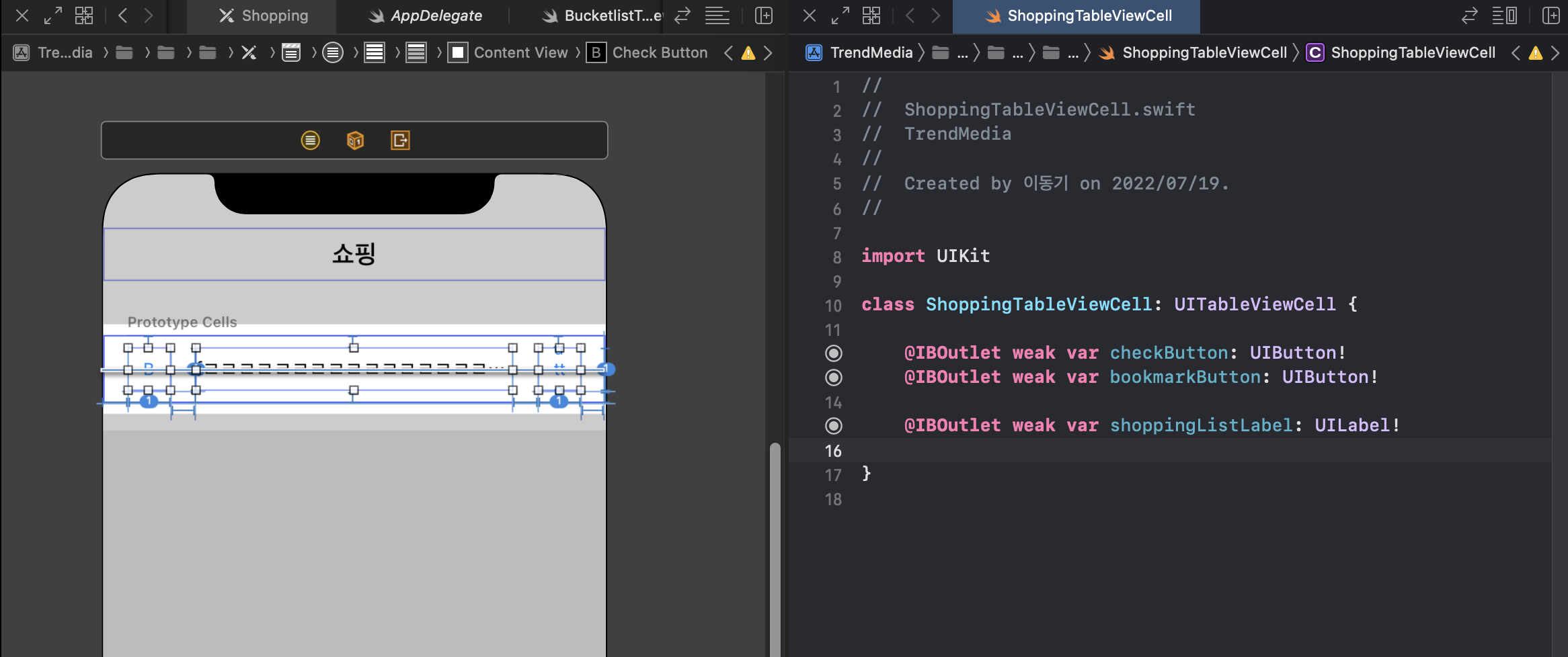 뷰 안에 userTextField와 addButton을 변수로 설정해주었습니다. 그리고 셀 안에 checkButton, shoppingListLabel, bookmarkButton을 변수로 설정해 주었습니다.(셀 안의 변수는 Table View Cell안에 설정!)
