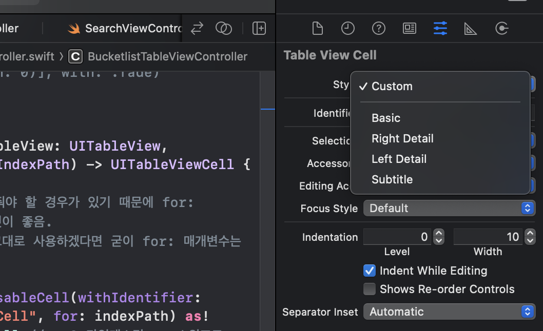 우리는 오늘 커스텀 셀을 만들거기 때문에 반드시 코드작성이 필요합니다. 그리고 위 사진에서 보았듯 Table View Cell의 Style을 Custom으로 해주셔야합니다.(그래야 커스텀 테이블 뷰 셀이죠!)