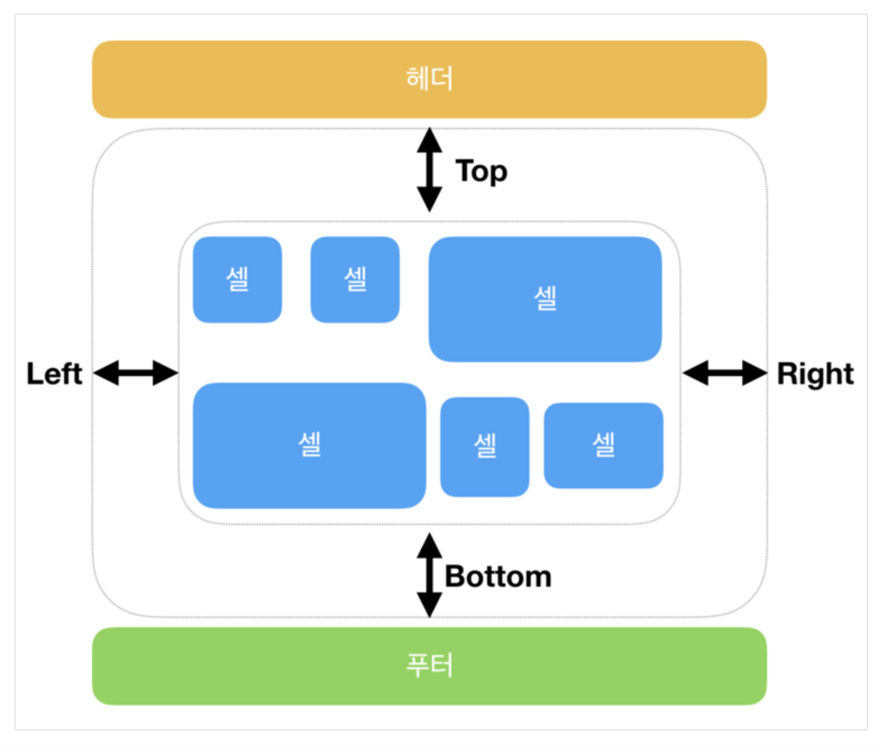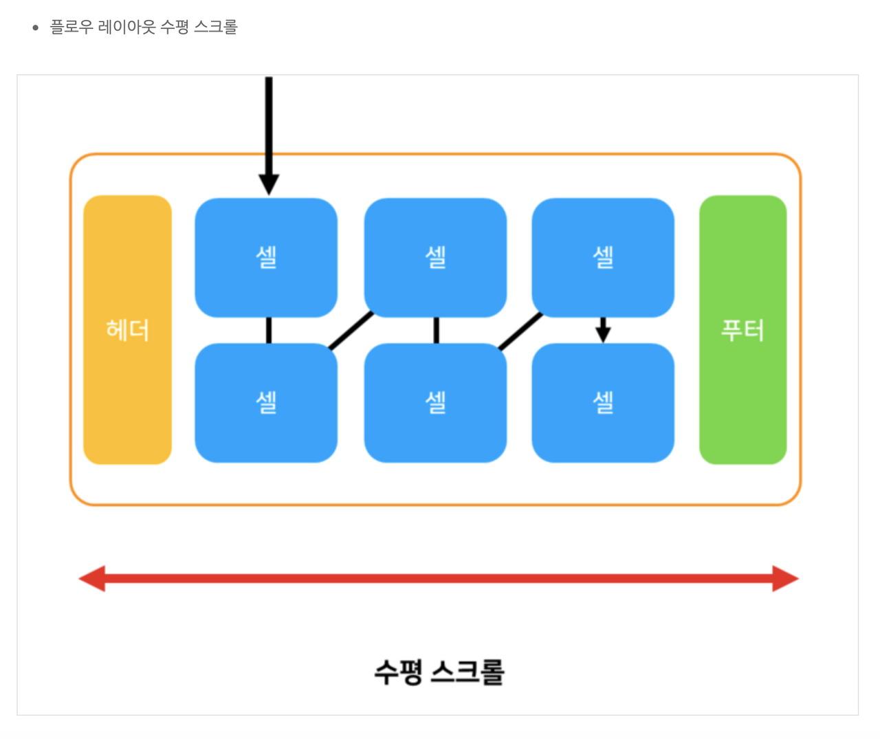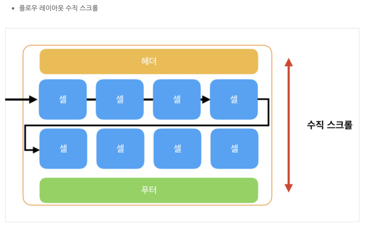 flow layout은 collection view layout을 상속받는 객체로 격자 형태로 레이아웃을 생성합니다. 최대한 많은 셀을 포함합니다. 이 layout은 행 또는 열의 방향(스크롤 방향에 따라 다름)으로 최대한 많은 셀을 배치합니다. 다만, 셀의 사이즈는 같을수도 다를 수도 있습니다.