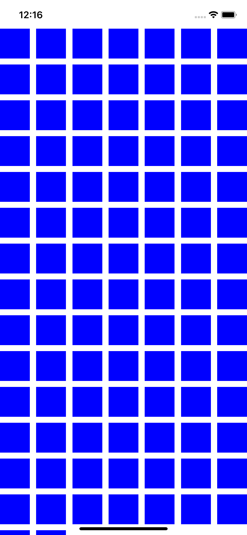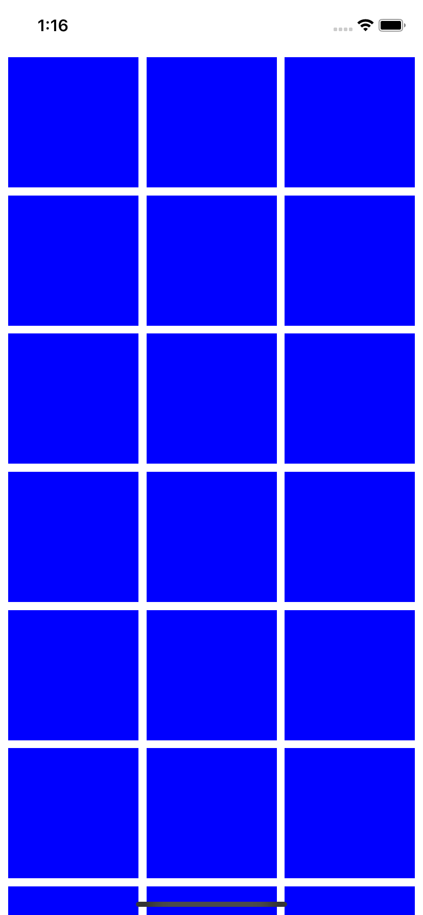 우리가 원하는 화면과는 조금 거리가 먼? 화면이 나타났습니다. 우리가 이미지 뷰의 크기는 완전히 무시되고 100개의 뷰가 한 화면에 나오게 되었습니다. 이러한 부분을 해결하려면 우리는 셀에대해 레이아웃을 설정 해주어야 합니다. 몇 가지 방법이 있지만 우리는 UICollectionViewFlowLayout을 사용해 보겠습니다.