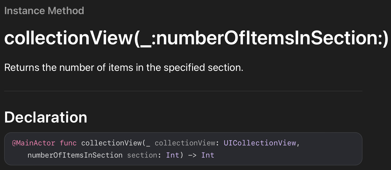 이 함수는 말그대로 몇 개의 아이템을 하나의 섹션에 가질 것인가를 정해주는 함수입니다. 이걸 100개로 나타내주면 100개의 셀이 나타나겠죠? 그럼 한 번 코드로 살펴봅시다.