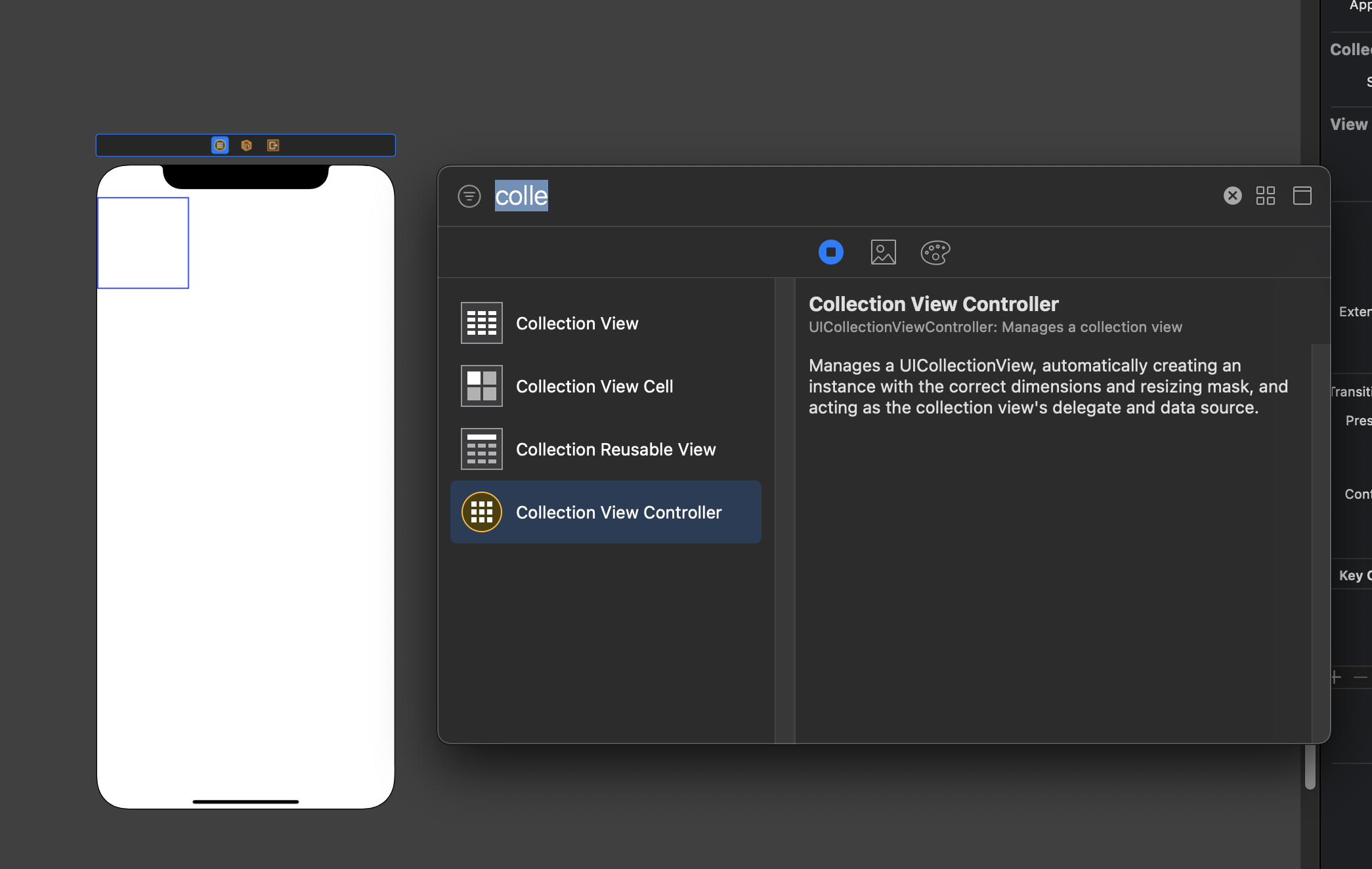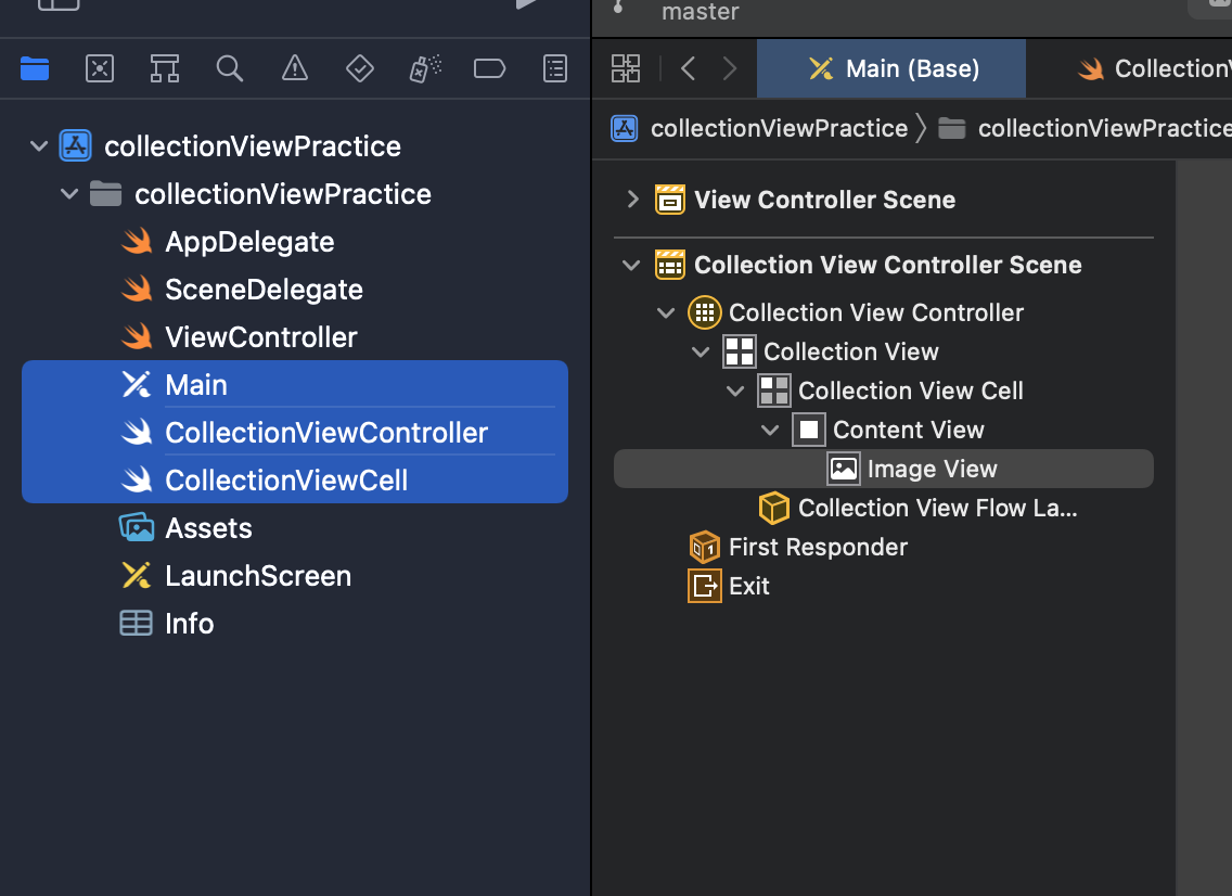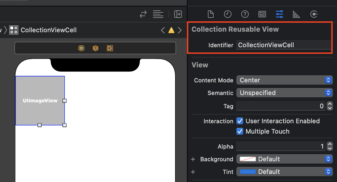 그런 다음 컬렉션 뷰 셀, 컬렉션 뷰 컨트롤러 파일을 만들고 커스텀 클래스로 지정해줍니다. 그리고 마지막으로 컬렉션 뷰의 identifier를 반드시!!! 지정해줘야합니다.(깜빡하기 매우 쉬움!!!)