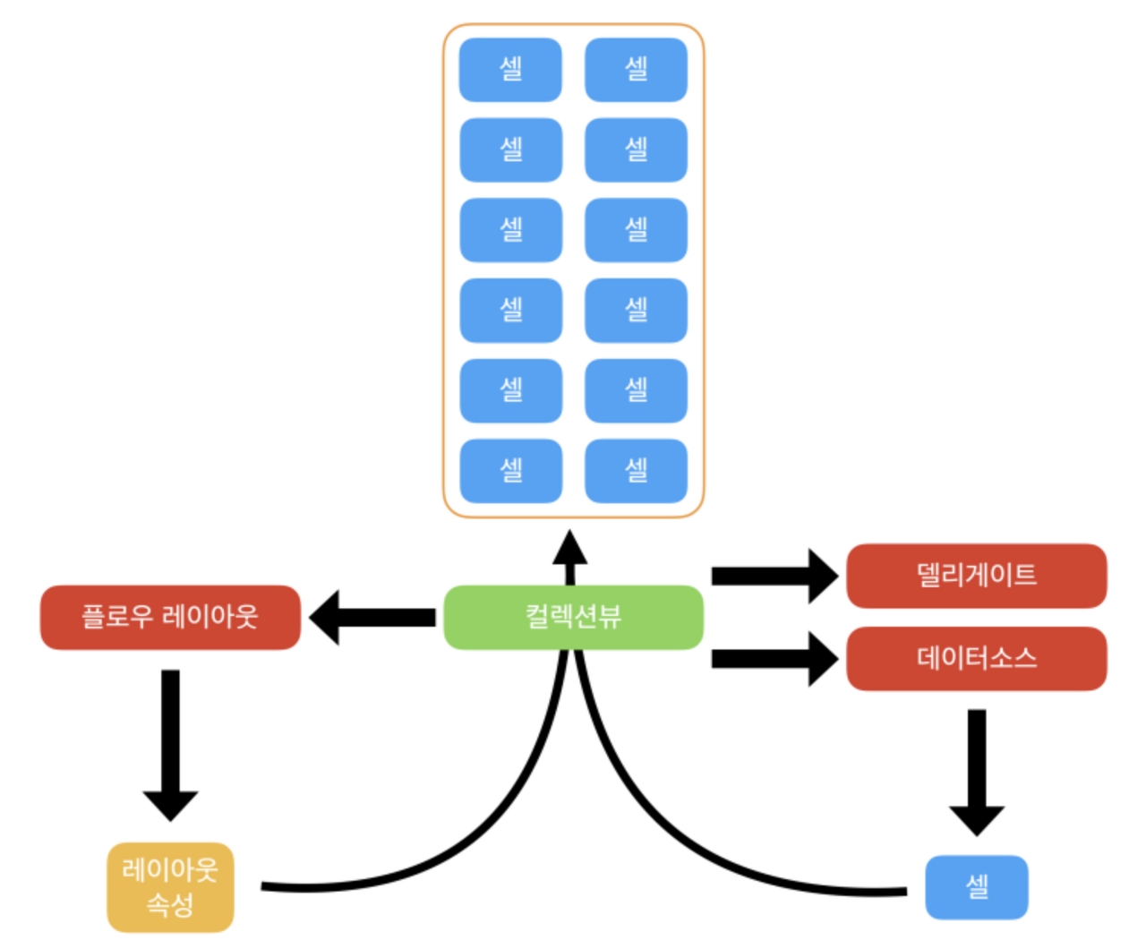 위 그림과 같이 컬렉션 뷰는 플로우 레이아웃을 통해 어떻게 아이템을 보여줄지 정하고 이와 관련된 데이터를 델리게이트, 데이트소스를 통해 관리합니다.