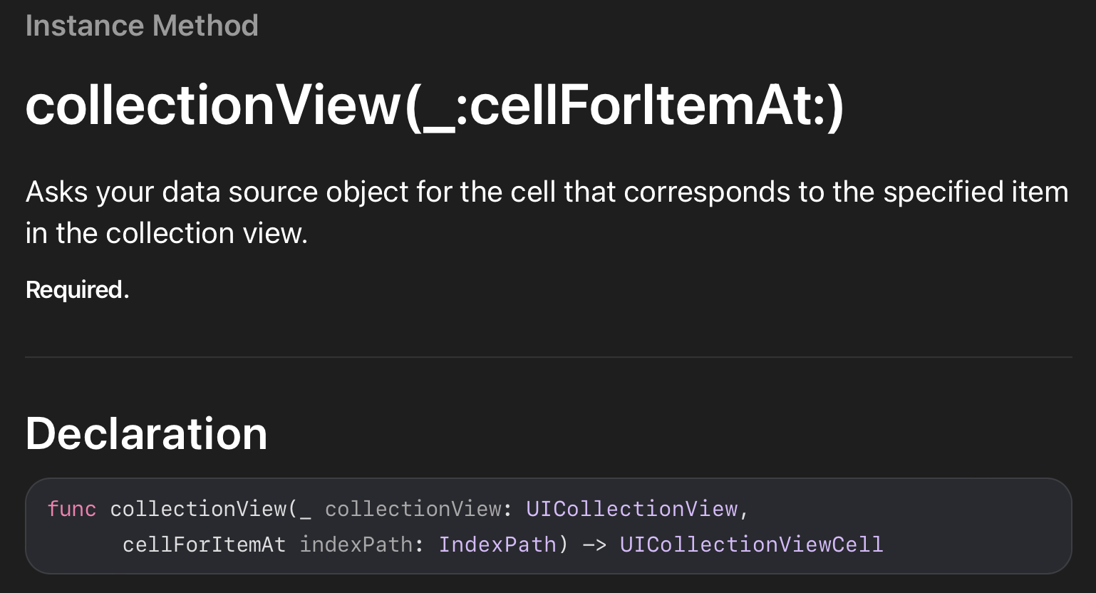 셀이 컬렉션뷰안의 특정 아이템들과 일치할 수 있도록 데이터 소스 객체에게 요청한다?... 쉽게 말하자면 컬렉션 뷰의 지정된 위치에 표시할 셀을 요청하는 메소드 입니다. 'Collection View Cell 에서 정보들을 가져오도록 요청해준다'라고 보시면 되겠습니다.