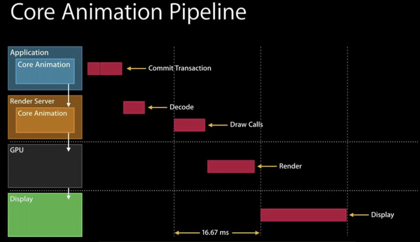 Core Animation은 위 그림의 Core Animation Pipeline을 따라 렌더링을 합니다. 그리고 해당 Pipeline에선 1/60초 후 작업을 준비하고 렌더링 서버로 데이터를 보낸 다음 1/60초 후에 렌더링을 완료합니다.